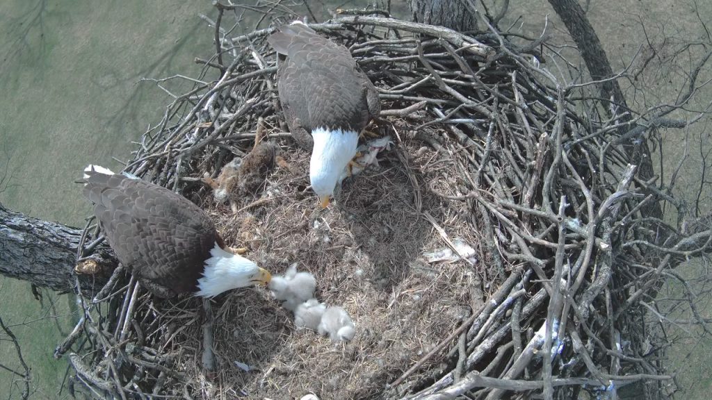 7 April 2022: All three chicks are in a huddle, surrounded by a smorgasbord of fish and turtles that have been provided to the nest today! Good hunting!